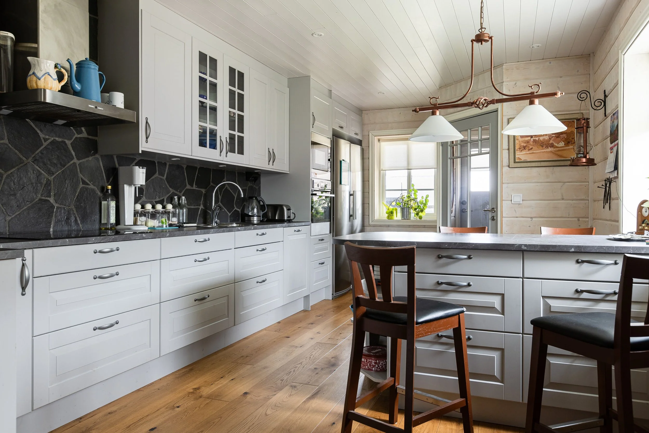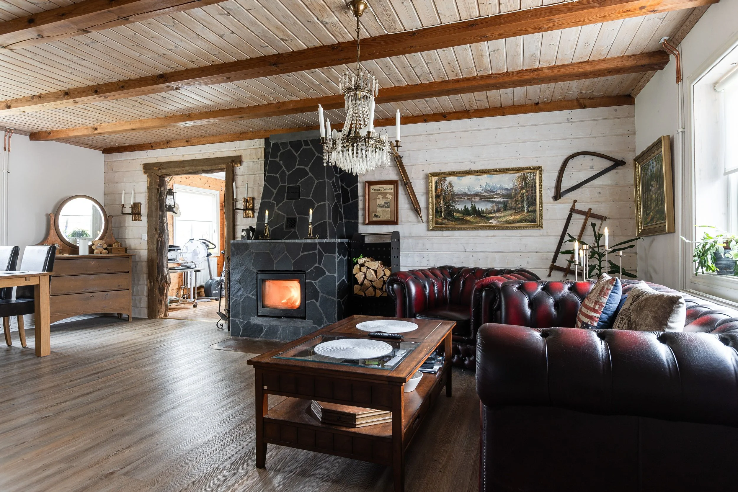 Originally built in 1929, the house reflects traditional construction methods. Inside, exposed wooden beams, solid wood floors and natural materials define the character of the space. A fireplace adds to the atmosphere of the main living area.
